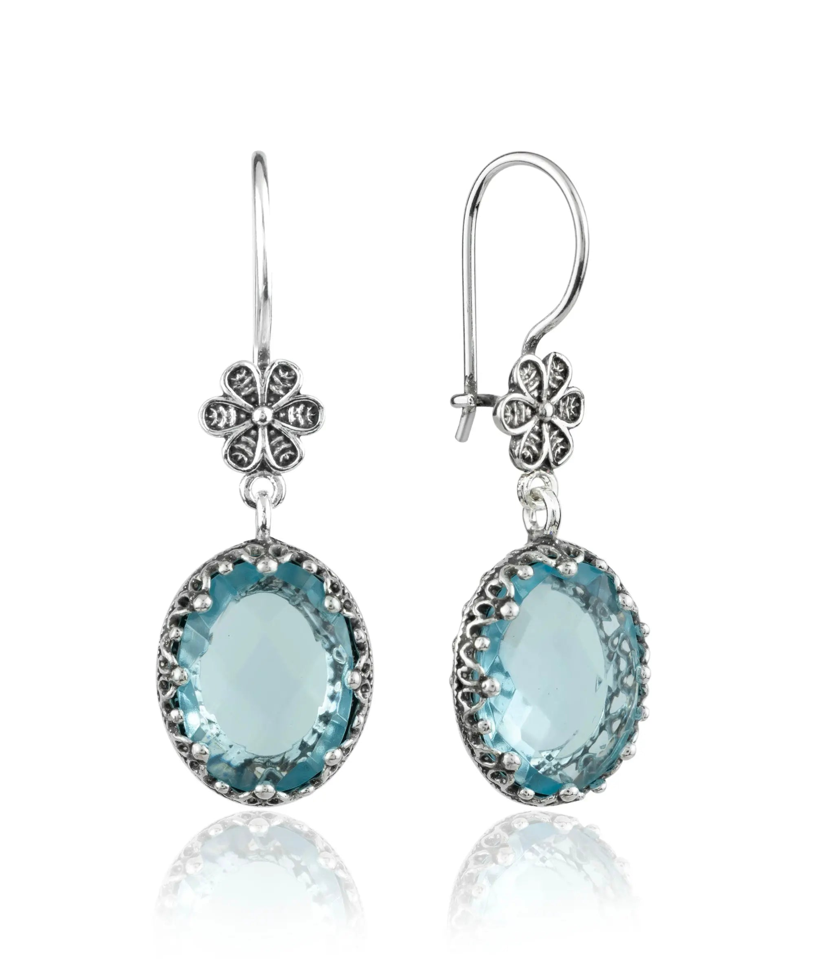 Filigree Art Blue Topaz Gemstone Women Silver Oval Dangle Earrings