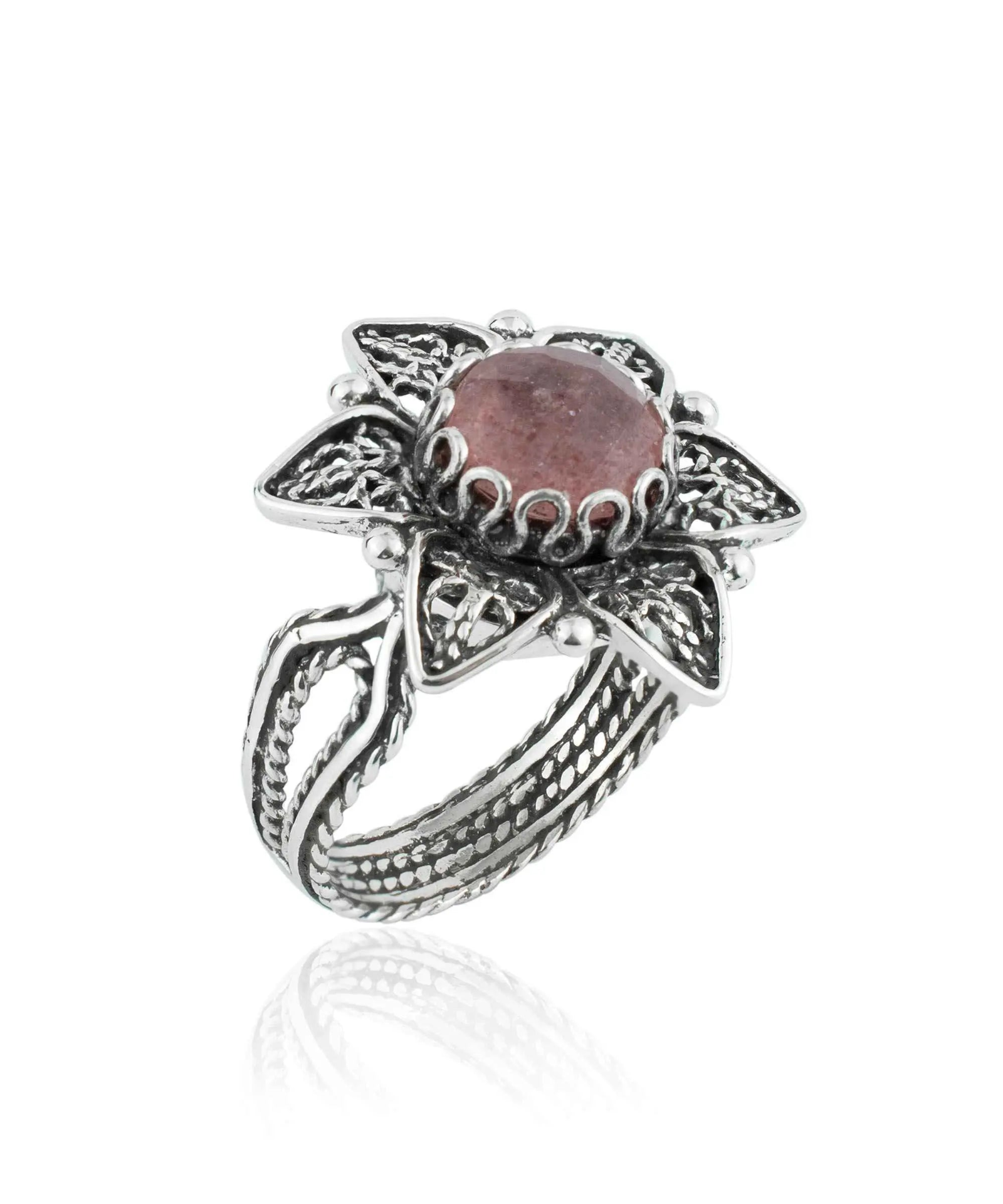 Filigree Art Cherry Quartz Gemstone Daisy Flower Women Silver Cocktail Ring