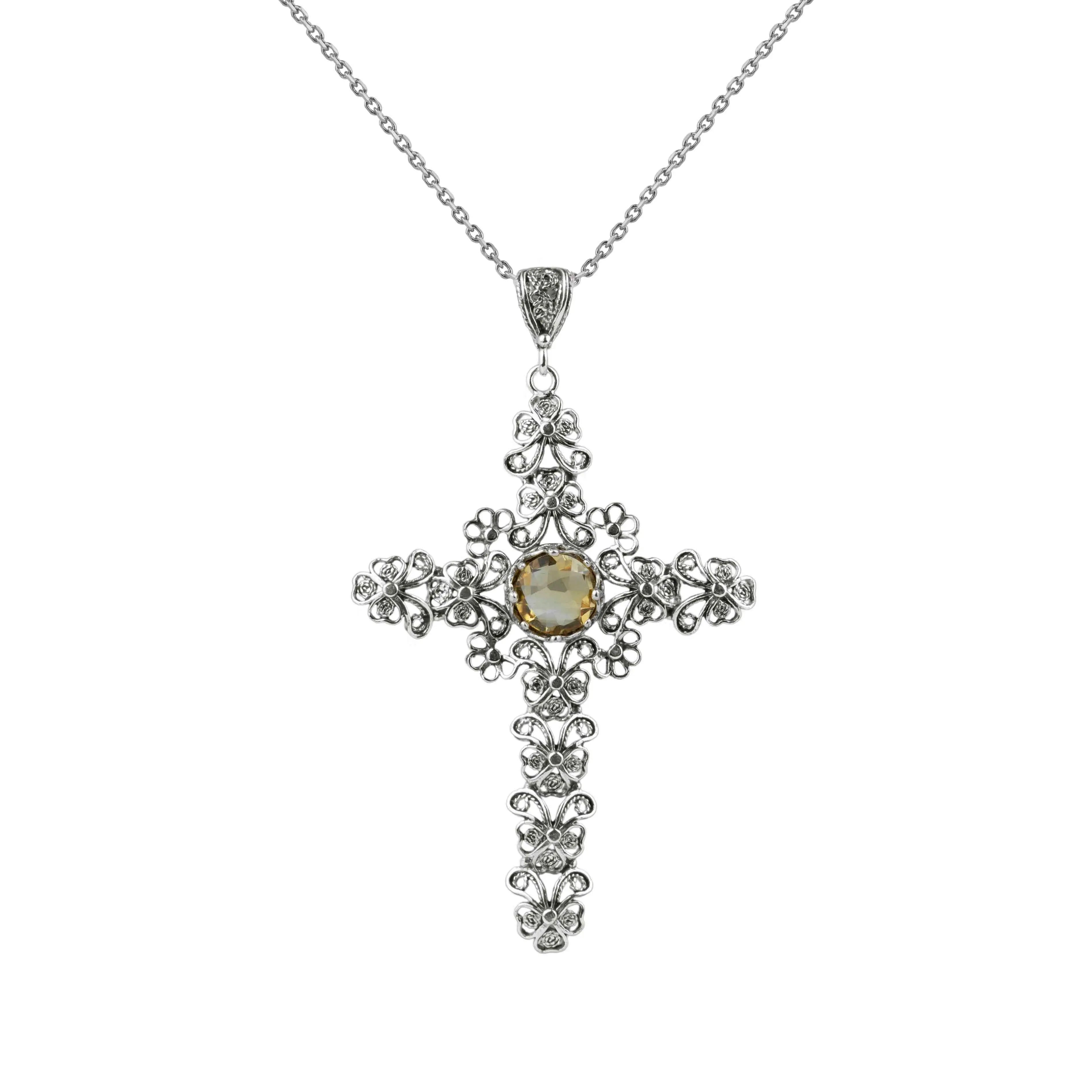 Filigree Art Citrine Gemstone Silver Cross Design Women Pendant Necklace
