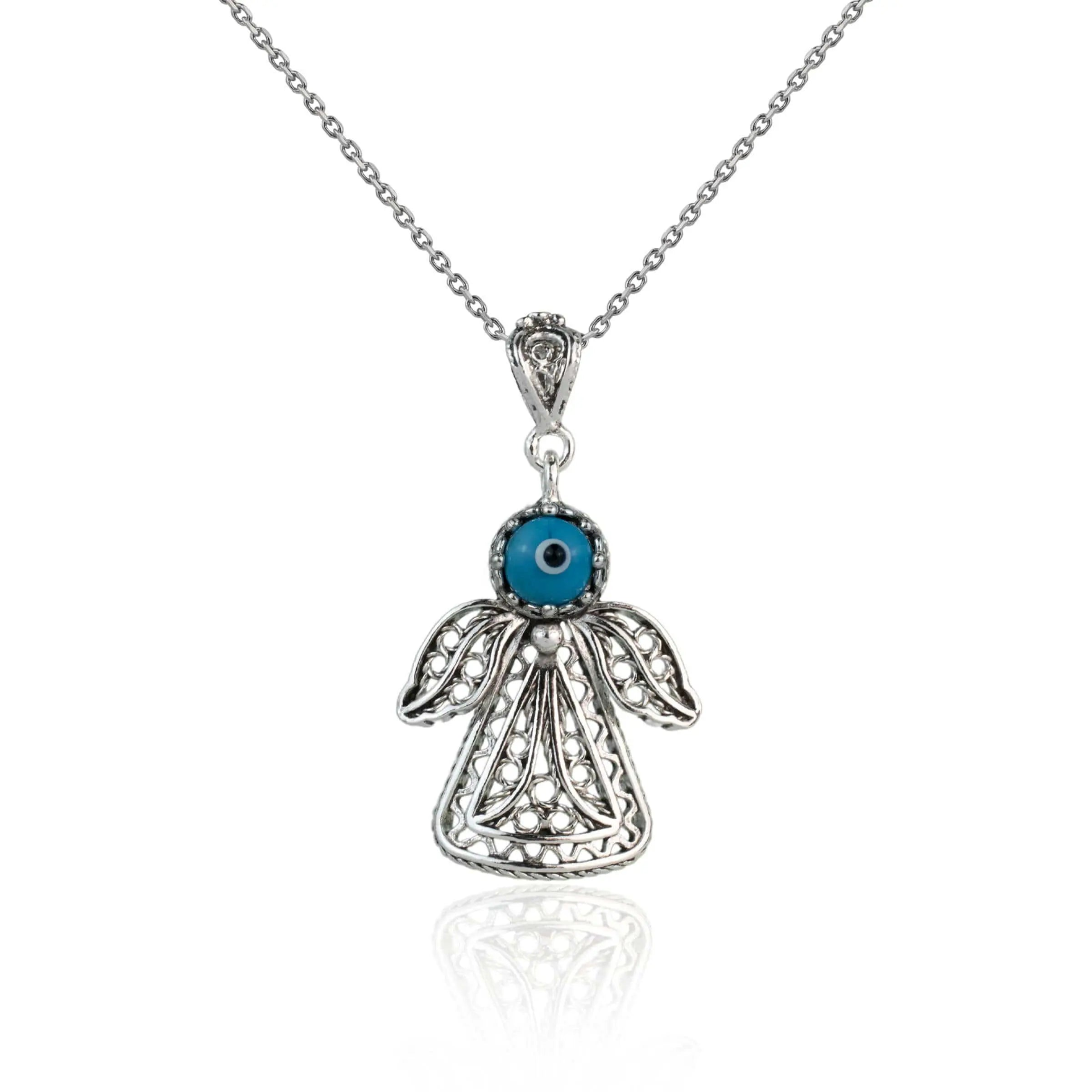 Filigree Art Evil Eye Beaded Angel Figured Women Silver Pendant Necklace