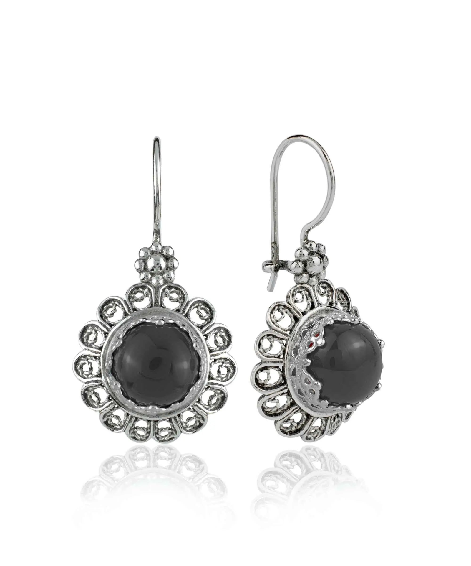 Filigree Art Flower Design Black Onyx Gemstone Women Silver Drop Earrings