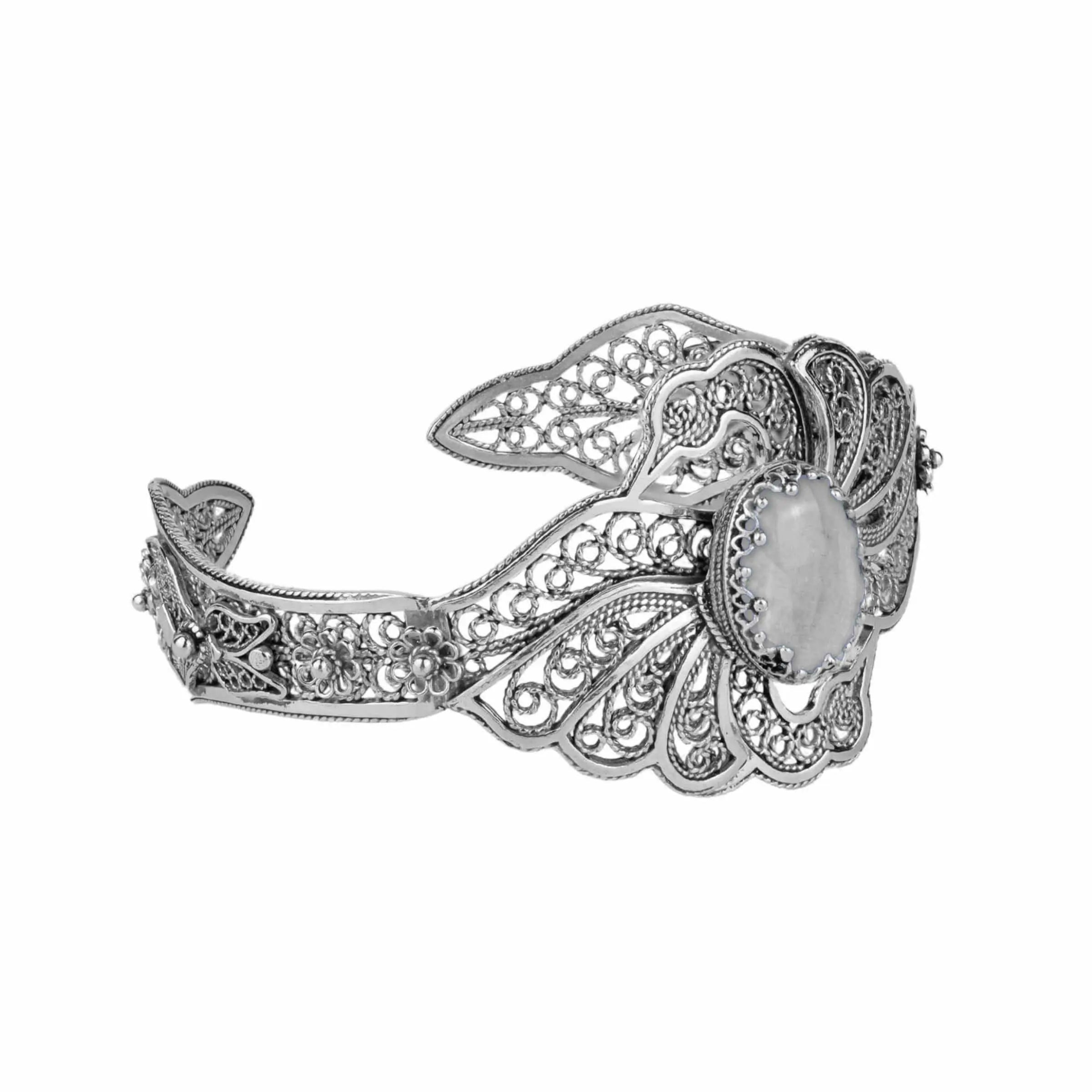 Filigree Art Gray Moonstone Gemstone Double Swan Figured Women Silver Cuff Bracelet