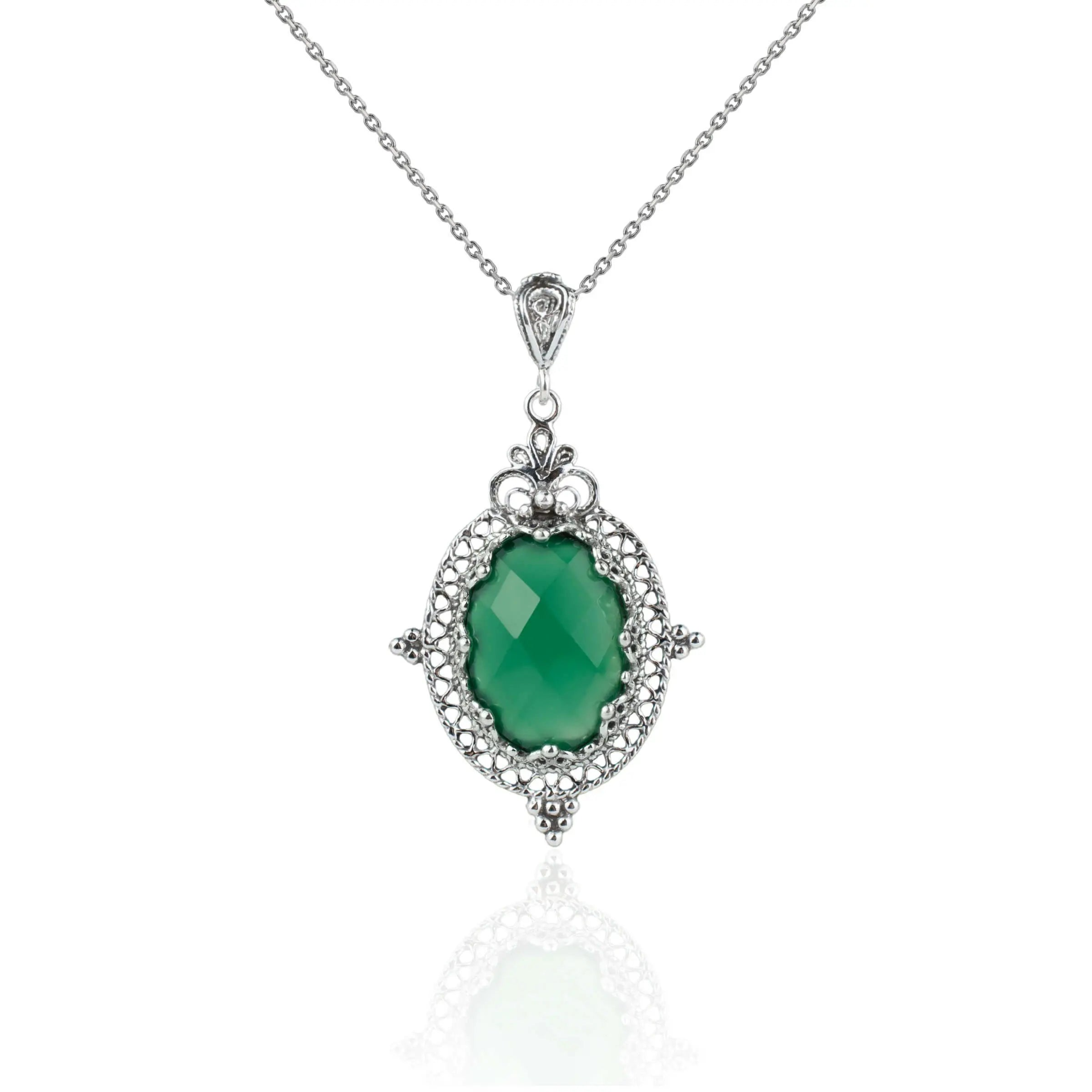 Filigree Art Green Agate Gemstone Women Silver Oval Pendant Necklace