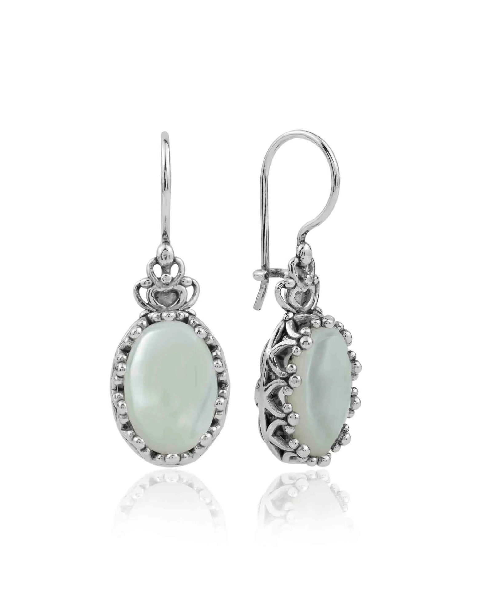 Filigree Art Mother of Pearl Gemstone Crown Figured Women Silver Oval Drop Earrings