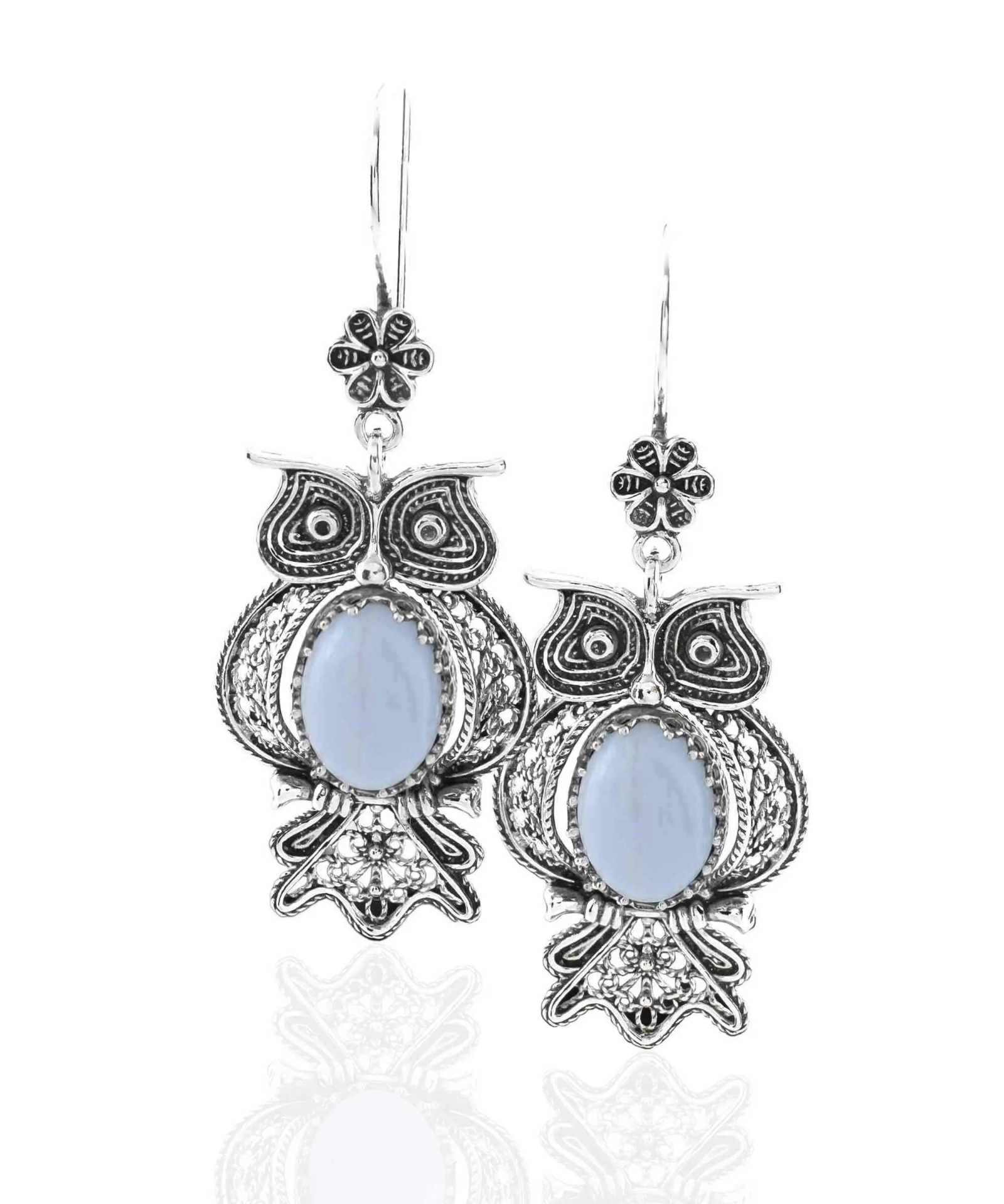 Introducing these exquisite Blue Lace Agate gemstone dangle drop earrings featuring a beautifully crafted 925 sterling silver filigree owl design. Handmade by our master artisan, these earrings are the perfect blend of traditional and modern art, featuring intricate filigree details that are both elegant and timeless.