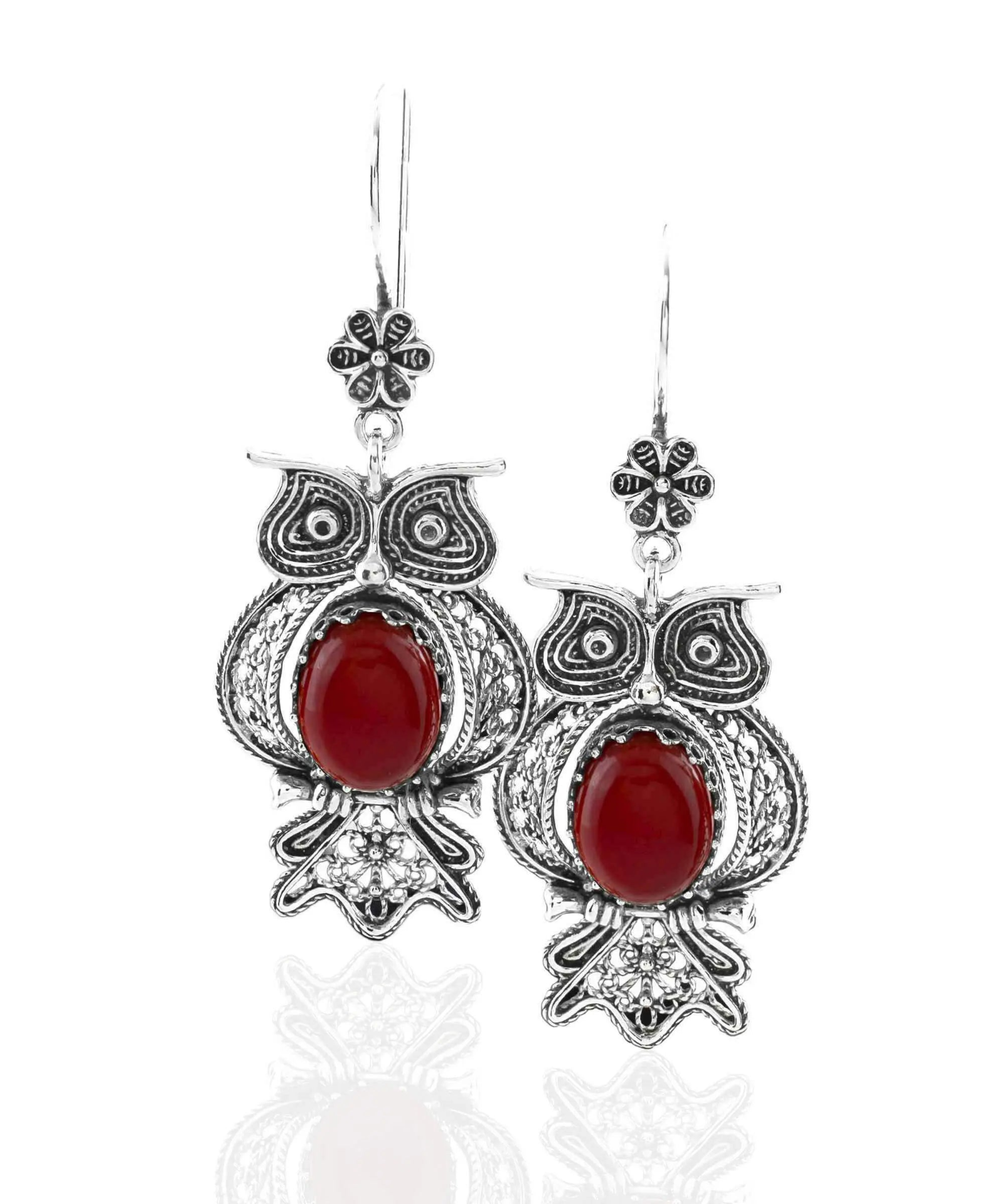 Filigree Art Owl Figured Carnelian Gemstone Women Silver Dangle Earrings