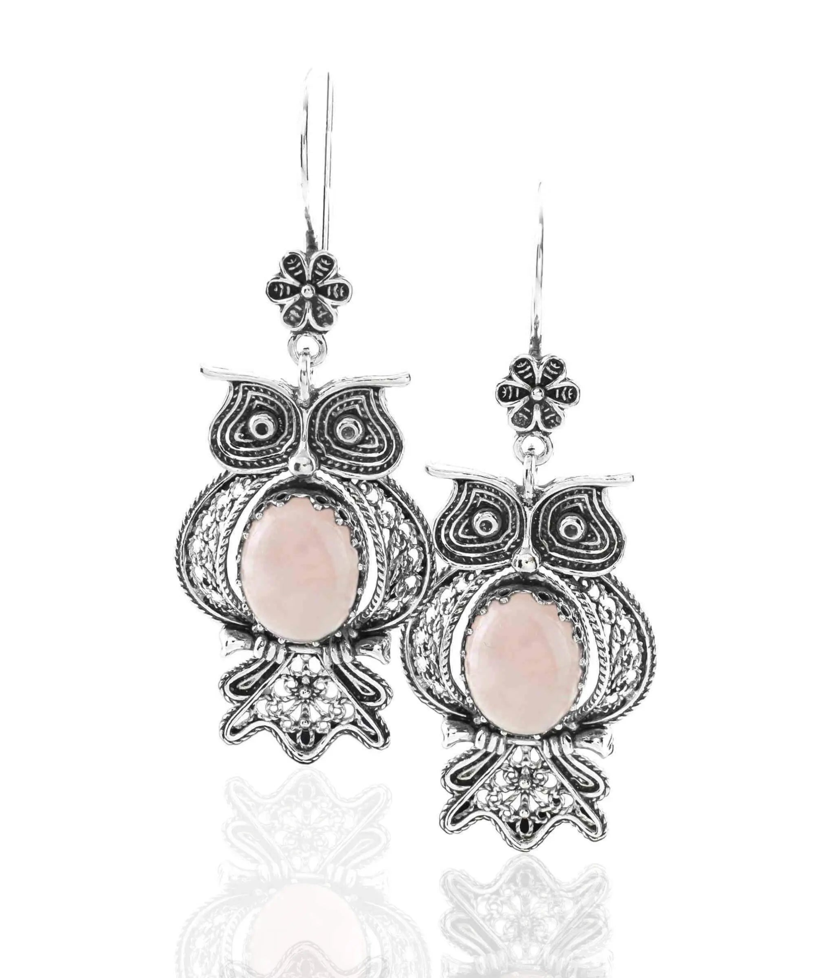 Introducing our stunning owl-figured 925 sterling silver filigree art women's dangle drop earrings, featuring a beautiful Rose Quartz gemstone. Each pair is handcrafted by a master artisan in our workshop, boasting gorgeous filigree details and multi-layers of 925 sterling silver oxidized finishes.
