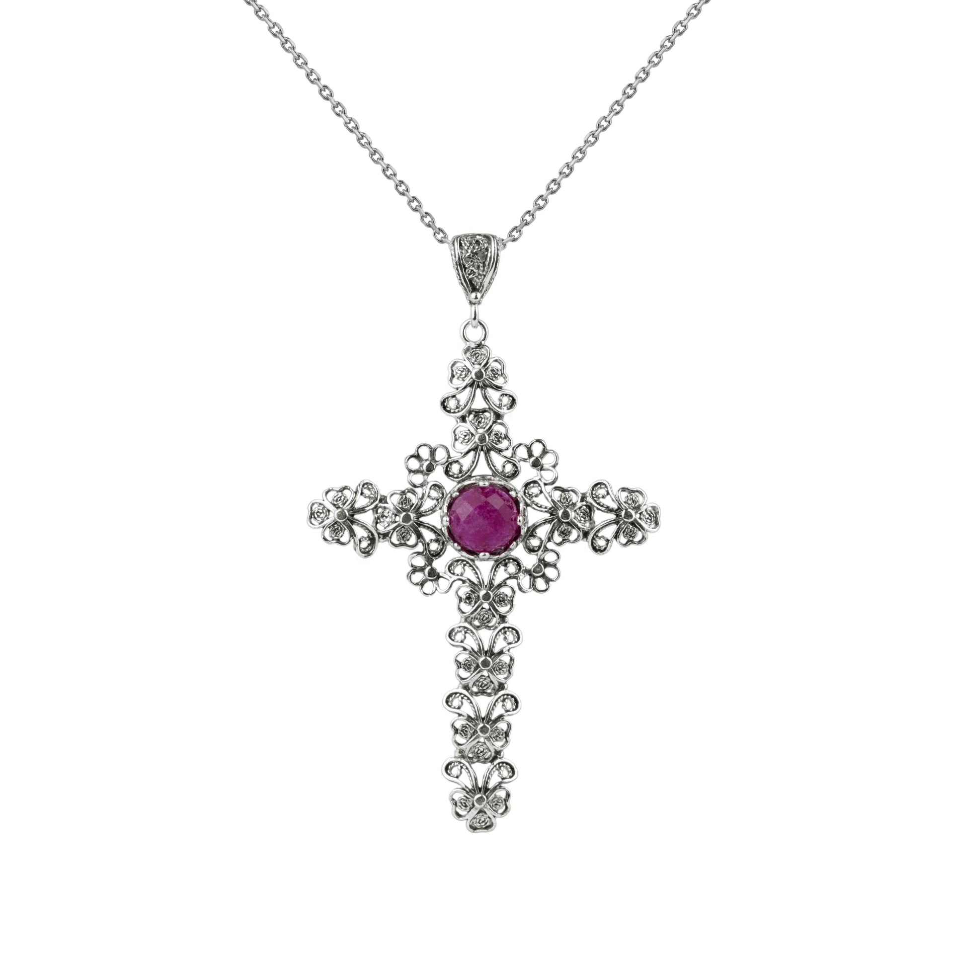 Filigree Art Ruby Corundum Gemstone Silver Cross Design Women Pendant Necklace