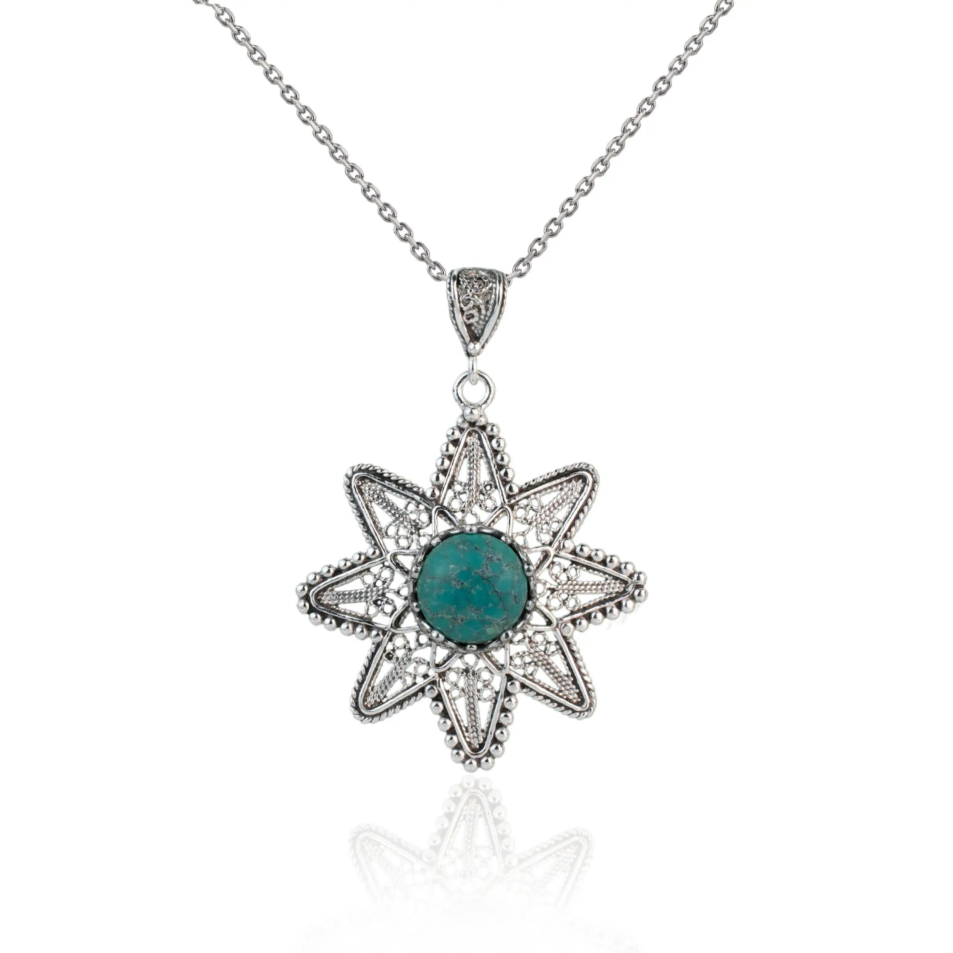 Filigree Art Turquoise Gemstone Sunflower Design Women Silver Pendant Necklace