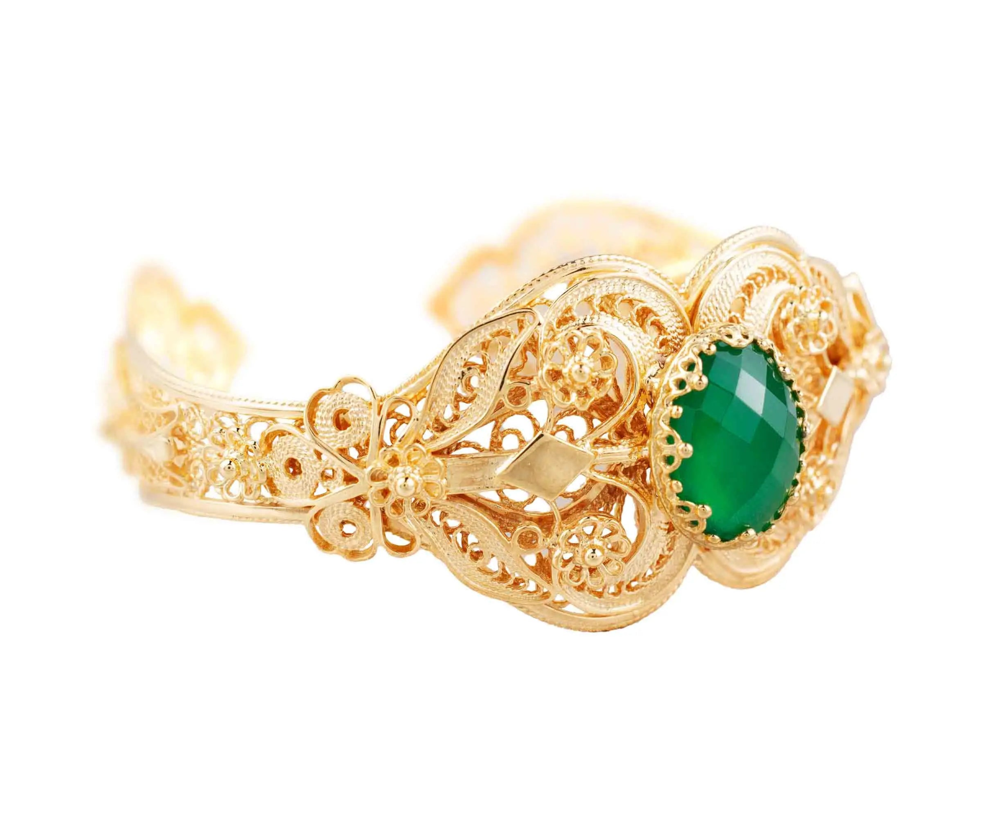 Filigree is an art form that originated in Mesopotamia and Anatolia, and our expertly crafted piece is a beautiful combination of old and modern art. Order now and experience the beauty and elegance of our 14k gold plated Sterling Silver Filigree Art triple-layered cuff bracelet with green agate gemstone for yourself!