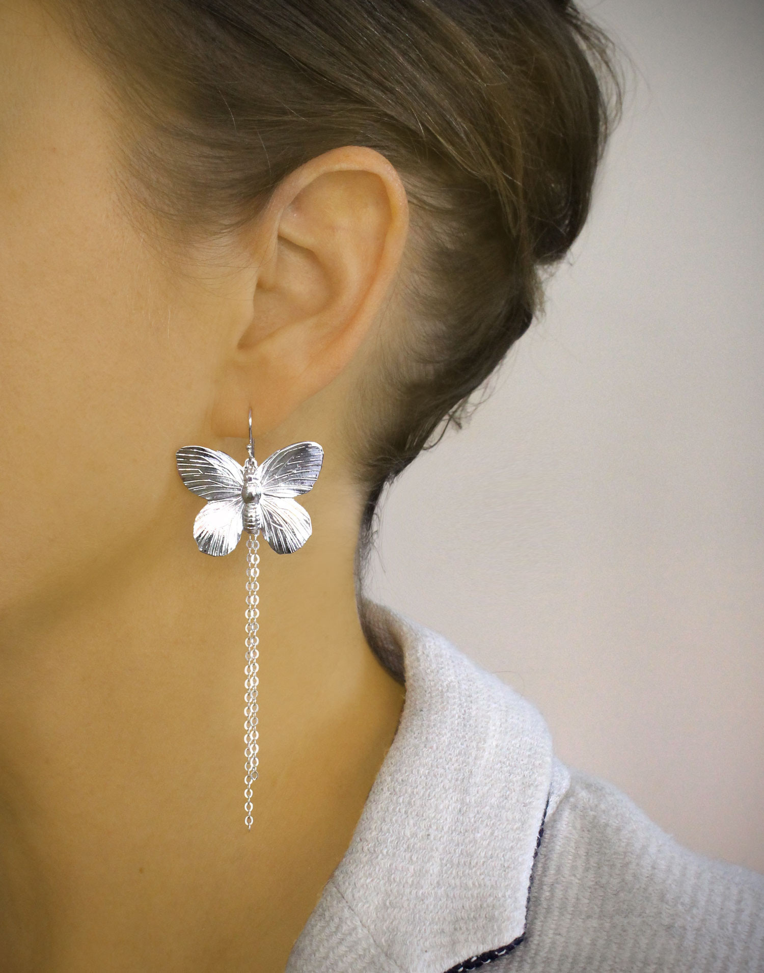 If you're looking for a pair of jaw-dropping earrings, these are for you! Stylish and eye-catching, this ultra-glamorous pair of long-length rhodium plated butterfly earrings, will steal the show. Handcrafted and decorated with dangling chain elements, they add an on-trend touch to a chic outfit. An excellent gift for a butterfly lover.