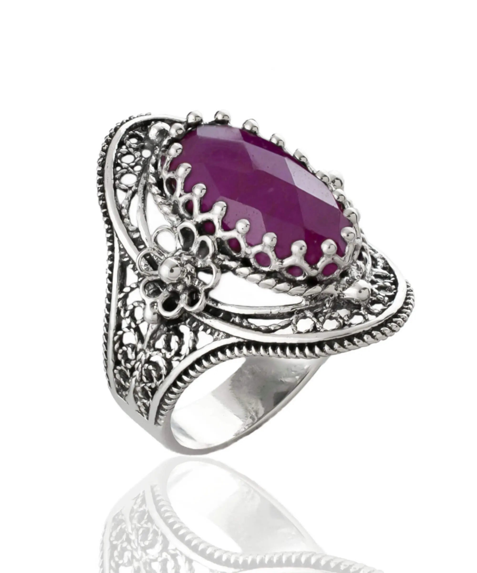 Indulge in the luxurious beauty of our Ruby Corundum Oval Ring, meticulously designed and crafted from high-quality sterling silver. The ring face boasts a highly polished finish that captures and reflects light magnificently, adorned with two delicate daisy figures on either side. Elevating its elegance is the double-sided faceted, checkerboard oval cut opaque, dyed Ruby Corundum gemstone. Available in sizes 5 to 12.5, this statement piece is crafted for daily wear with enduring style.