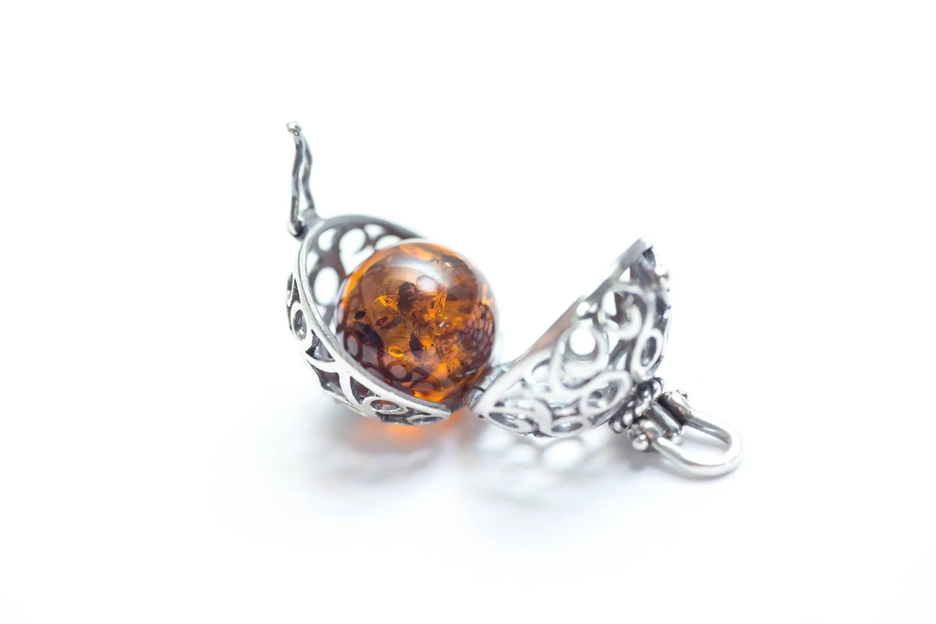 An intricate, sterling silver locket, with an enchanting filigree design. Inside the locket, hides a perfectly spherical baltic amber stone.