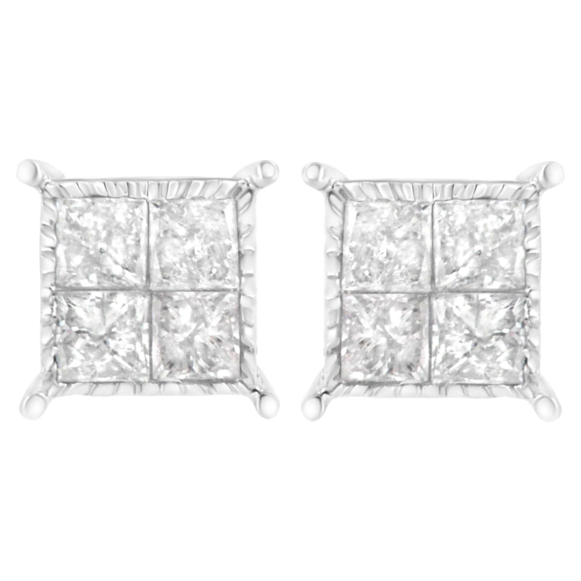 These elegant sterling silver stud earrings features 3/4 carats of beautiful, natural diamonds. Each stud is embellished with 8 princess-cut diamonds in an invisible setting. These rectangular earrings come with a push back finding and will add the perfect amount of sparkle to your everyday wear.