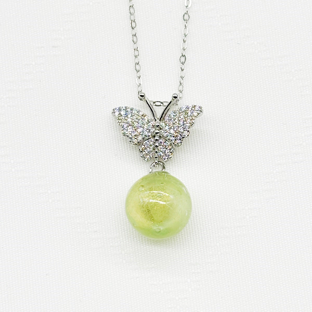 Elevate your style with our stunning new Diamond Butterfly Aroma Necklace with green ball, a harmonious blend of exquisite design and timeless aroma. Crafted with care, the pendant and chain gleam are purely Sterling Silver (925 silver) adorned with beautiful white cubic zirconia stones, while the Murano glass pieces are meticulously hand-blown.