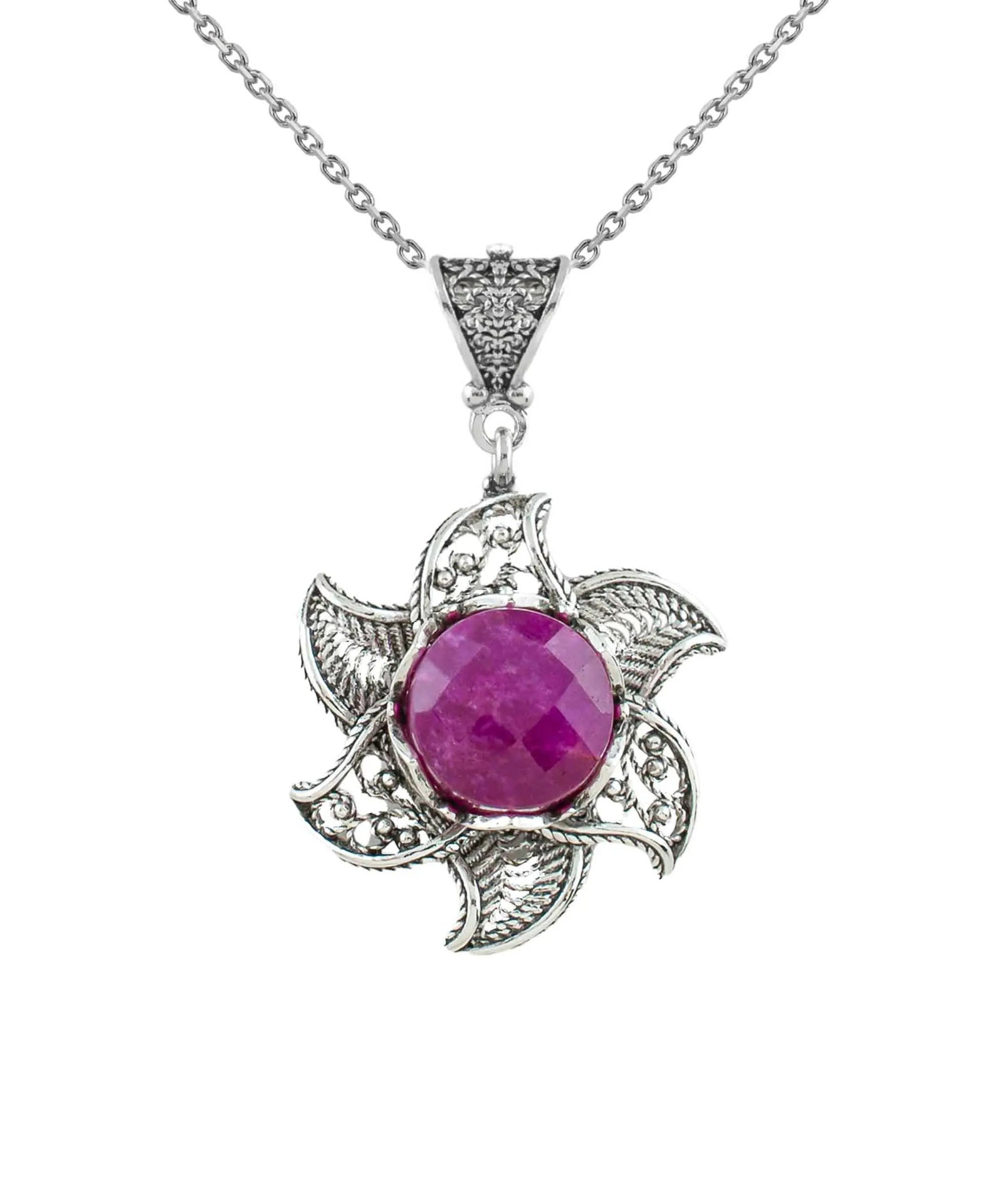 Sterling Silver Filigree Ruby Corundum Gemstone Blossoming Lotus Flower Pendant Necklace