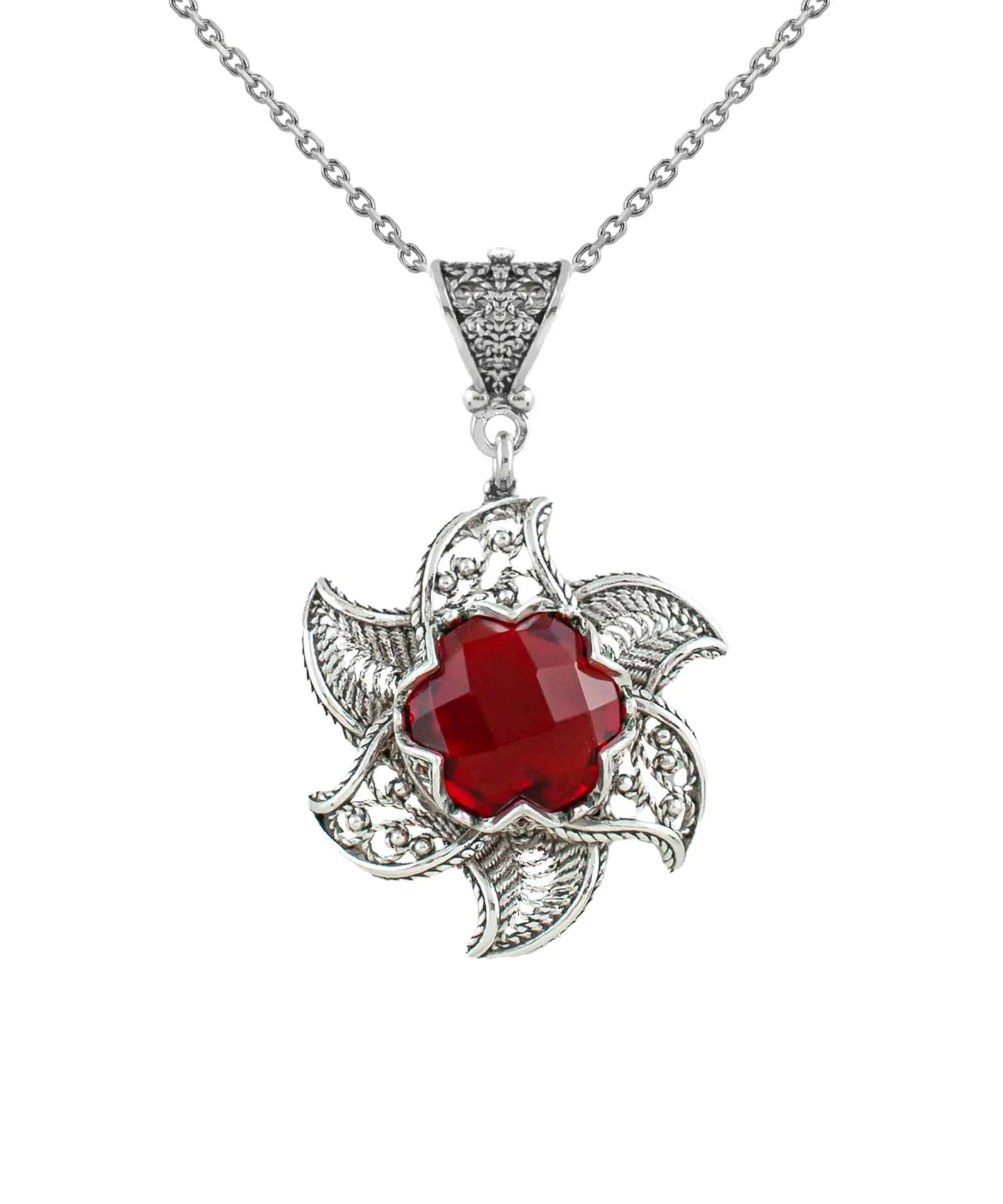 Sterling Silver Filigree Ruby Gemstone Blossoming Lotus Flower Pendant Necklace
