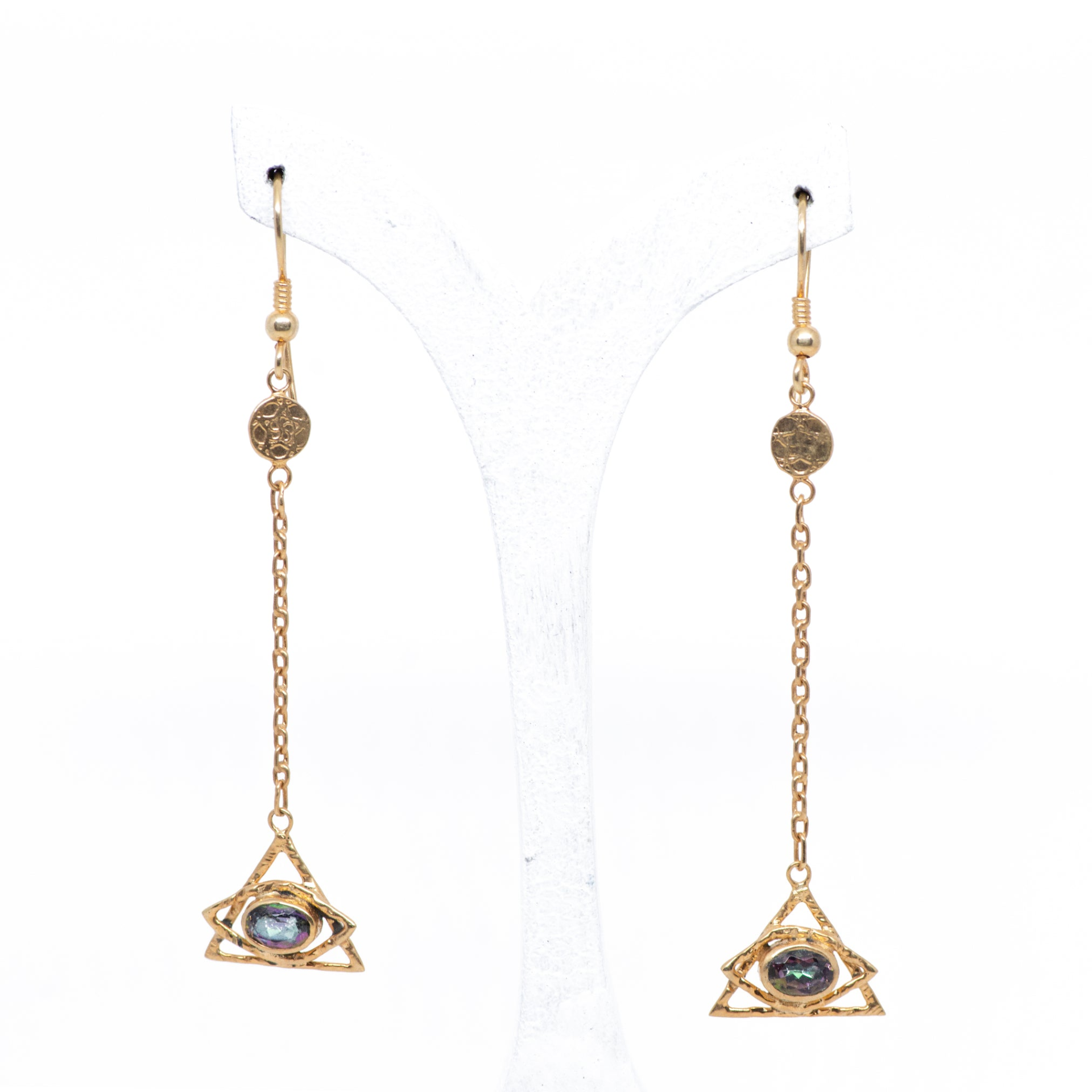 The Eye Of Horus is a strong symbol of protection while the mystic topaz helps you express yourself clearly. Handcrafted in Indonesia transforming recycled ship parts in delicate earrings featuring chain and exquisite gems.