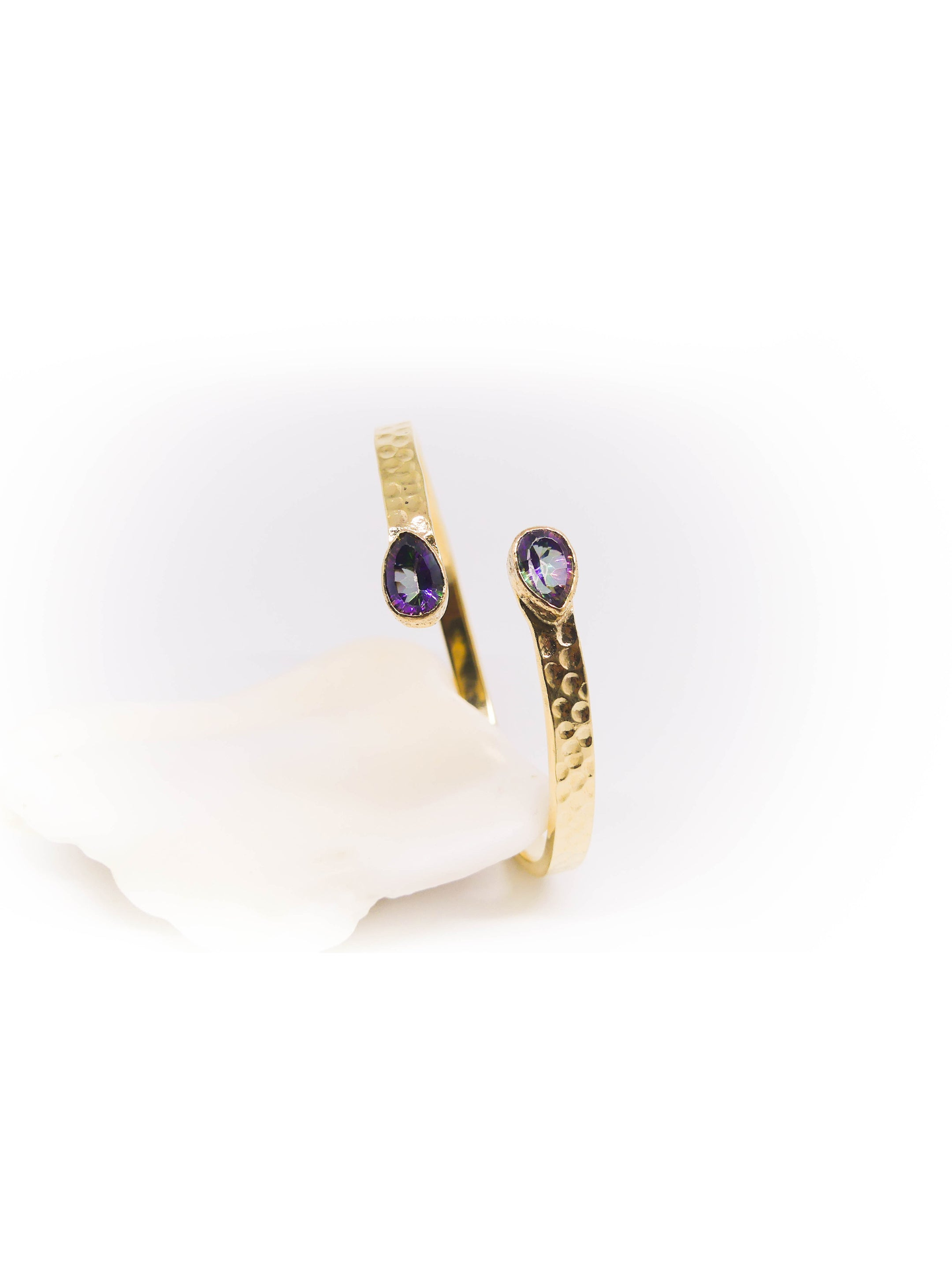 The Kiara bangle is a fabulous way to add an extra layer to your bangles. Sits perfectly on you lower forearm.  Mystic topaz is used in this design to soothe the inner aura and the energy surrounding you.